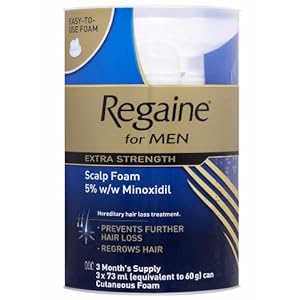 Always read the Product Leaflet carefully before using medicationDo not use if you :Are a womanDon't know why your are losing your hair - see your doctorHave sudden or patchy hair lossHave other conditions associated with your hair lossHave a red, inflamed, irritated, infected or painful scalp, or shaven headHave a dressing or bandage on your scalpAre using other medications on your scalpAre under 18 or over 49 years of ageSeek advice from your doctor if you have heart disease (including abnormal heart rhythms or rates, angina or chest pains) and/or circulation disorders, before using this product. Avoid contact with the eyes.Regaine for Men Extra Strength Scalp Foam is a white to off-white cutaneous foam for topical use.Special Warning and Precautions prior to using Scalp FoamBefore using Regaine for Men Extra Strength Scalp Foam 5% w/w Cutaneous Foam, the user should determine that the scalp is normal and healthy. Minoxidil is not indicated when there is no family history of hair loss, hair loss is sudden and/or patchy, hair loss is due to childbirth, or the reason for hair loss is unknown. The patient should stop using Regaine for Men Extra Strength Scalp Foam 5% w/w Cutaneous Foam and see a doctor if hypotension is detected or if the patient is experiencing chest pain, rapid heartbeat, faintness or dizziness, sudden unexplained weight gain, swollen hands or feet or persistent redness. Patients with known cardiovascular disease or cardiac arrhythmia should contact a physician before using Regaine for Men Extra Strength Scalp Foam 5% w/w Cutaneous Foam. Regaine for Men Extra Strength Scalp Foam 5% w/w Cutaneous Foam is for external use only. Do not apply to areas of the body other than the scalp. Hands should be washed thoroughly after applying the foam. Regaine for Men Extra Strength Scalp Foam 5% w/w Cutaneous Foam contains ethanol (alcohol), which will cause burning and irritation of the eye